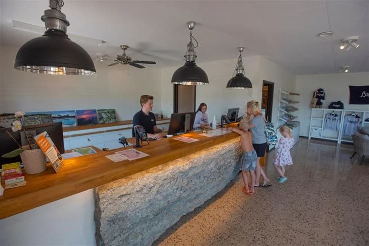 Incheckning sker från kl. 15.00 och utcheckning senast kl. 14.00 för campingtomter. Kom ihåg att du behöver ett giltigt Camping-ID eller Camping Key Europe vid incheckning (gäller ej stuggäster). Detta kan enkelt skaffas digitalt eller i receptionen. Receptionen är bemannad stora delar av dygnet under högsäsong (07-23) och hjälper gärna till med turistinformation, bokning av bastu (den vedeldade vid havet kostar 400 kr för två timmar), eller om du behöver köpa en eladapter. Gratis Wifi via Telia finns tillgängligt på området. En bil per tomt/stuga får parkeras inne på området i mån av plats, övriga bilar hänvisas till gratis parkering utanför. Laddning av elbil sker vid särskilda laddstationer (betalning via app eller Swish) – det är förbjudet att ladda från elstolpen vid din ställplats (böter 500 kr).